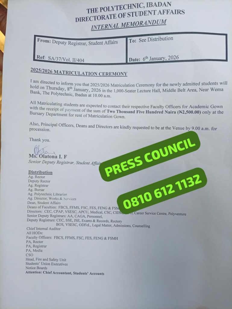 The Polytechnic, Ibadan, is set to formally welcome its newly admitted students as it holds its matriculation ceremony for the 2025/2026 academic session.