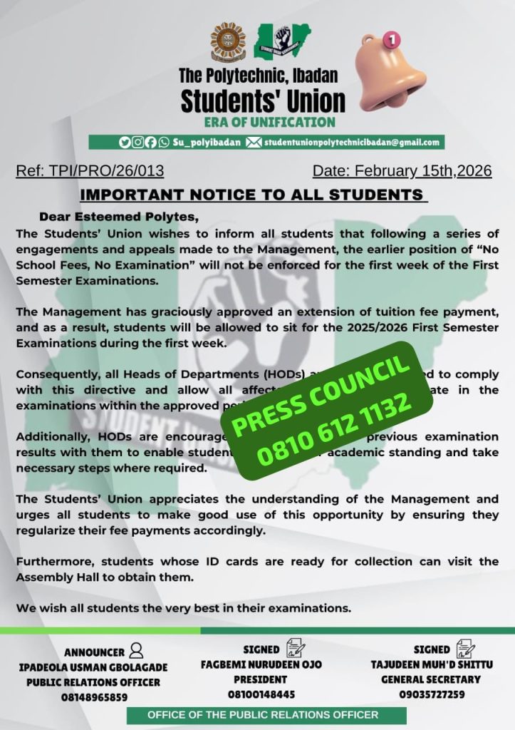 Management of The Polytechnic Ibadan has approved a one-week extension for students yet to complete payment of tuition fees, allowing them to participate in the 2025/2026 First Semester examinations. This decision follows appeals from the Students’ Union, who advocated on behalf of affected students to ensure uninterrupted access to their examinations while providing time to regularize outstanding payments.