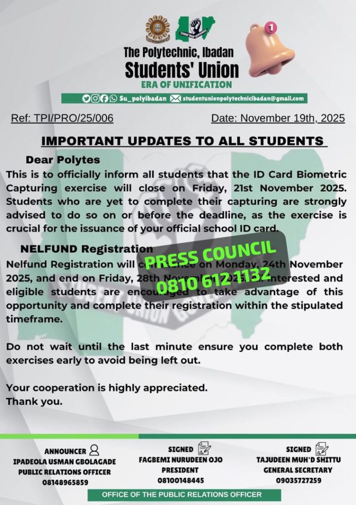 The Students’ Union (SU) of The Polytechnic, Ibadan, has announced that the ongoing ID card biometric capturing will officially close on Friday, November 21, 2025, while the Nigerian Education Loan Fund (NELFUND) registration will begin on Monday, November 24, 2025.