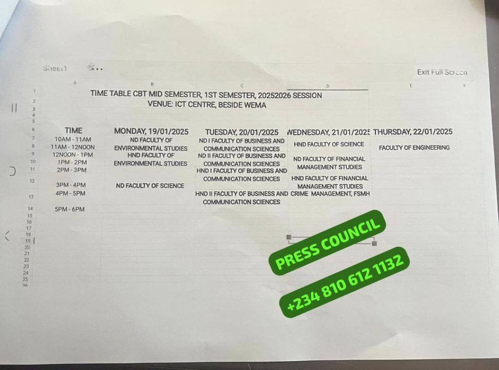 On Tuesday, January 20, ND I Faculty of Business and Communication Sciences will write from 10:00 a.m. to 12:00 p.m., ND II from 12:00 p.m. to 2:00 p.m., HND I from 2:00 p.m. to 3:00 p.m., and HND II from 4:00 p.m. to 5:00 p.m.